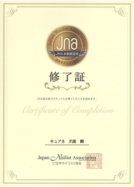 JNA本部認定校である当校にご入学頂き、指定カリキュラムを修了いただいた方へは、JNA発行の「JNA本部認定校 修了証」を交付いたします。これは、JNA本部認定校を卒業された方だけの特典です。