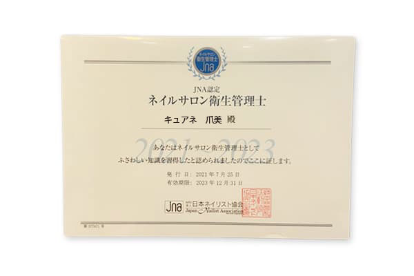ネイリスト技能検定資格は、内閣総理大臣が認めたJNECが認証する資格です。